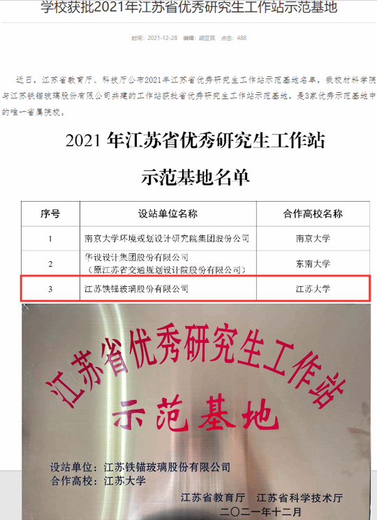 我院与江苏铁锚玻璃股份有限公司共建的研究生工作站,成功获批 2021 年江苏省优秀研究生工作站示范基地,是3家示范基地中唯一省属院校项目。伟德victor1946将以此为契机,深化校企协同,持续提升研究生培养质量与科研创新能力。