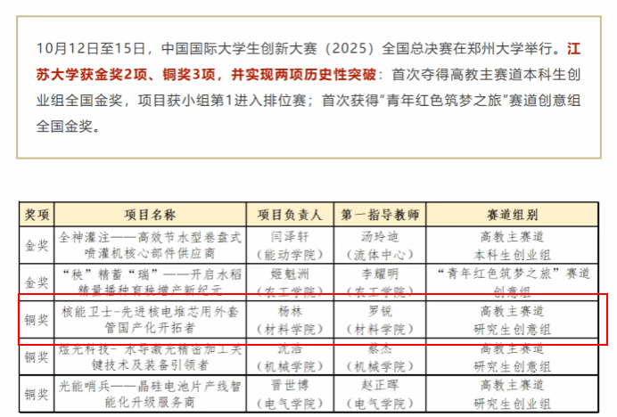 核电堆芯用外套管国产化开拓者”项目获中国国际大学生创新大赛全国铜奖。